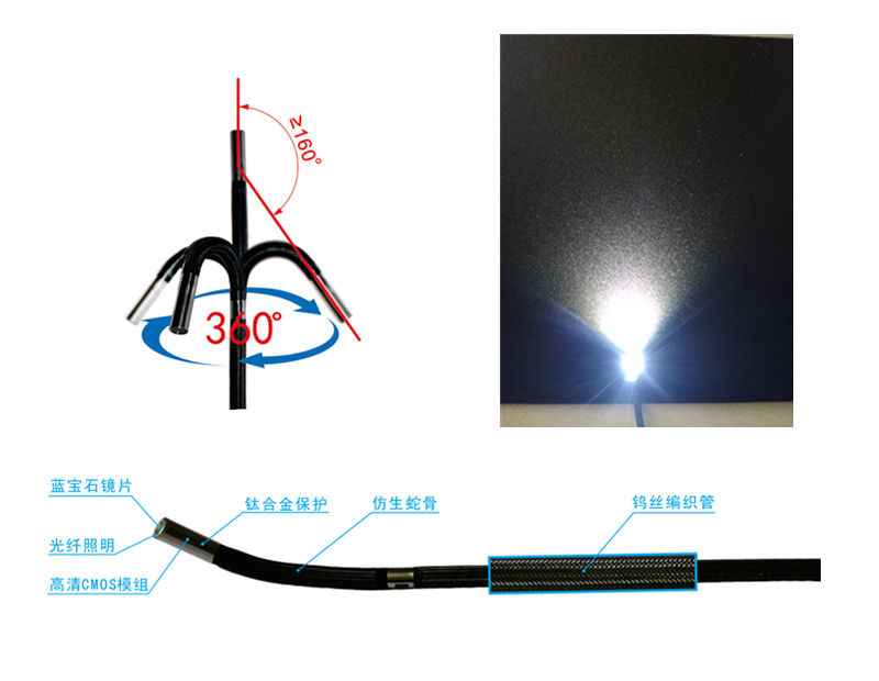 探头采用精密机械式操控导向,360度任意旋转;要实现探头与操控摇杆同步摆动,没有任何延迟。导向机构有遇障碍过载保护功能,能有效的避免牵引导线拉断。