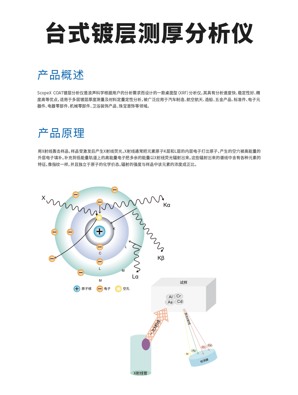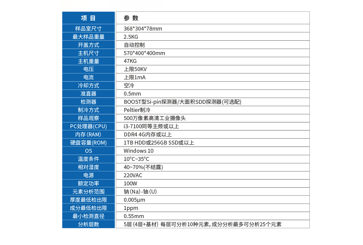 产品概述:镀层分析仪是根据用户的分析需求而设计的一款桌面型(XRF)分析仪,其具有分析速度快、稳定性好、精度高等优点,适用于多层镀层厚度测量及材料定量定性分析。
