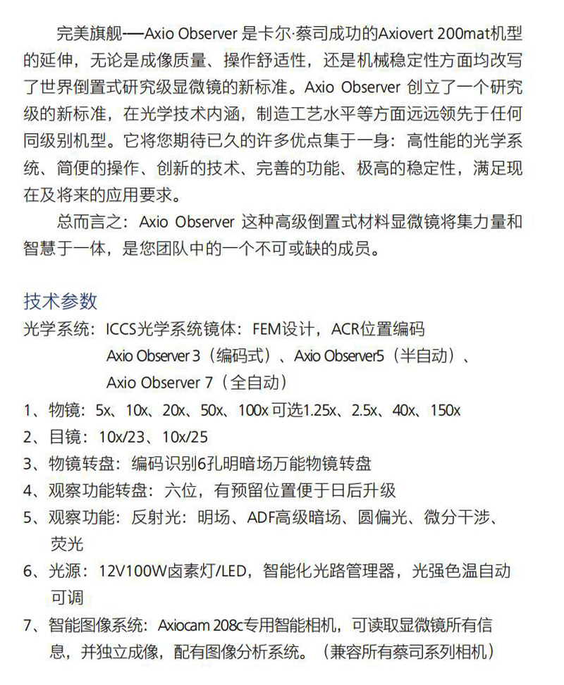 产品概述:Axio Observer 是卡尔蔡司成功的Axiovert 200mat机型 的延伸, 无论是成像质量、操作舒适性, 还是机械稳定性方面均改写 了倒置式研究级显微镜的新标准。Axio Observer 创立了—个研究 级的新标准, 在光学技术内涵, 制造工艺水平等方面远远优7于任何同级别机型。