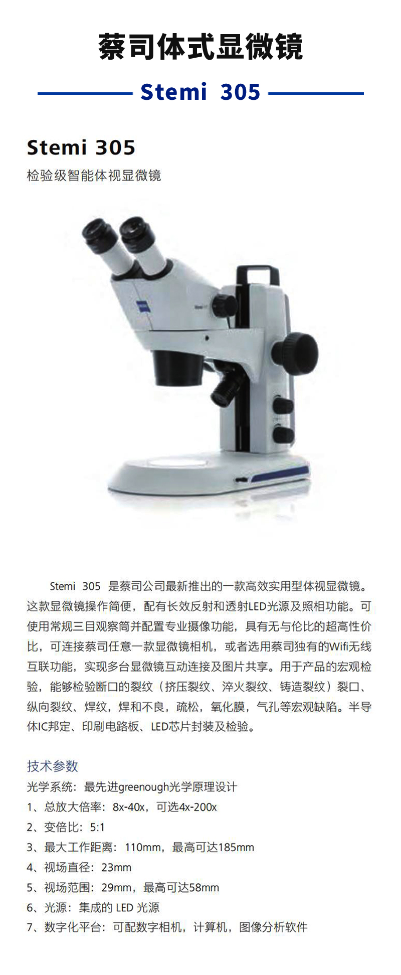 产品概述:这款显微镜操作简便,配有长效反射和透射LED光源及照相功能。可 使用常规三目观察筒并配置专业摄像功能,具有超高性价 比,可连接蔡司任意—款显微镜相机,或者选用蔡司的Wifi无线 互联功能,实现多台显微镜互动连接及图片共享。用于产品的宏观检 验,能够检验断口的裂纹(挤压裂…