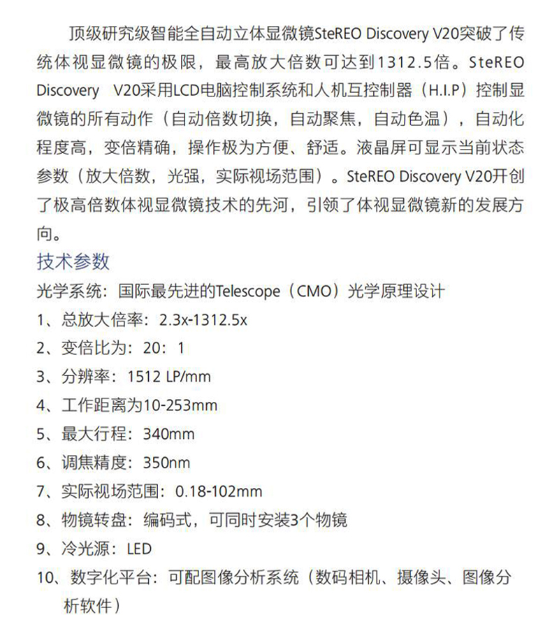 产品概述:研究级智能全自动立体显微镜SteREO Discovery V20突破了传 统体视显微镜的极限,放大倍数可达到 1312.5倍。 SteREO Discovery V20采用LCD电脑控制系统和人机互控制器 (H.I.P )控制显 微镜的所有动作(自动倍数切换,自动聚焦,自动色温),自动化 程度高,变倍准确,操作极为方…