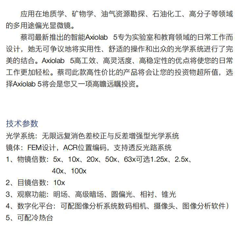 产品概述:智能Axiolab 5专为实验室和教育领域的日常工作而 设计,她无可争议地将实用性、舒适的操作和出众的光学系统进行了完 美的结合。Axiolab 5高工效、高灵活度、高稳定性的优点将使您的日常 工作更加轻松。