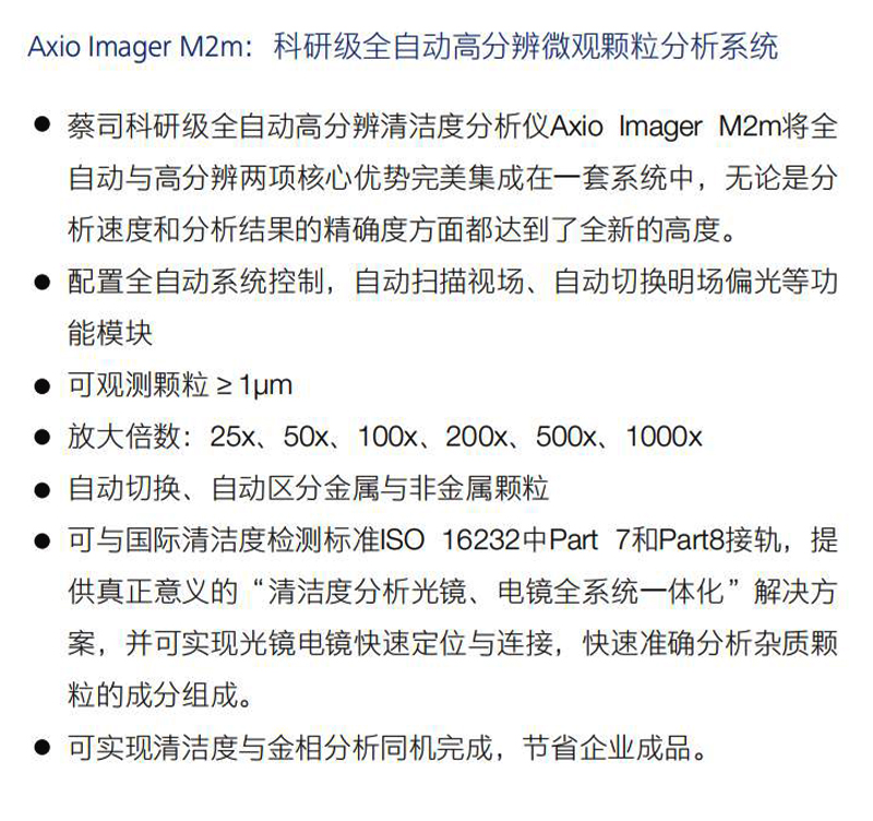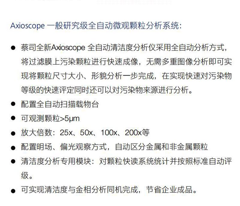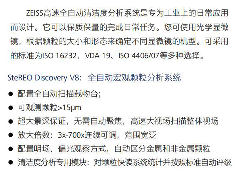 产品概述:ZEISS高速全自动清洁度分析系统是专为工业上的日常应用 而设计。它可以保质保量的完成日常任务。您可使用光学显微 镜, 根据颗粒的大小和形态来确定不同显微镜的机型。可采用 的标准为ISO 16232 、VDA 19 、ISO 4406/07等多种选择。
