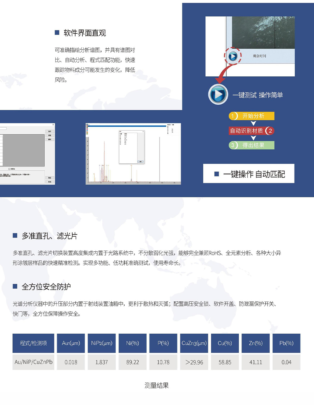 产品概述:全新下照式设计、性价比高、适用性强,轻松快速解决各种平面件、异形件及电镀液的检测,且能自动判定测试结果