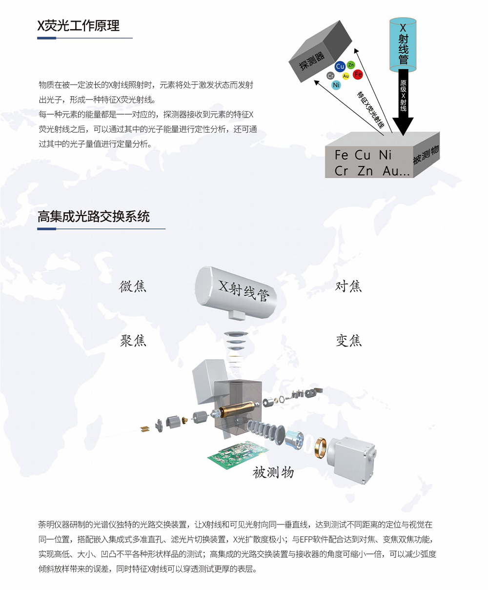 产品概述:下照式微聚焦多准型,搭载先进的EFP算法软件和微光聚集技术,配合切换准直器在检测各微小及凹凸面样品时检出限更低,仪器寿命更长,性能更稳定。