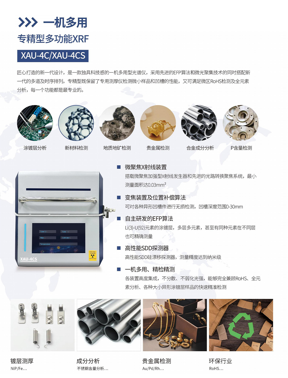 产品概述:匠心打造的新一代设计,是一款独具科技感的一机多用型光谱仪,采用先进的EFP算法和微光聚集技术的同时搭配新一代的多道及时序排列,专精型既保留了专用测厚仪检测微小样品和凹槽的性能,又可满足微区ROHS检测及全元素分析。