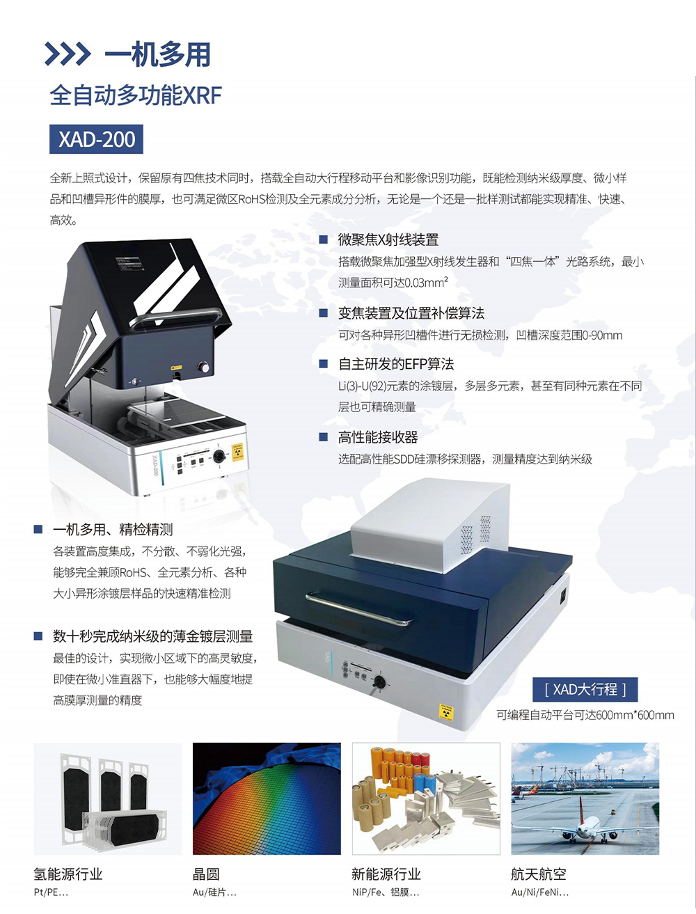 产品概述:全新上照式设计,保留原有四焦技术同时,搭载全自动大行程移动平台和影像识别功能,既能检测纳米级厚度、微小样品和凹槽异形件的膜厚,也可满足微区ROHS检测及全元素成分分析,无论是一个还是一批样测试都能实现精准、快速、高效。