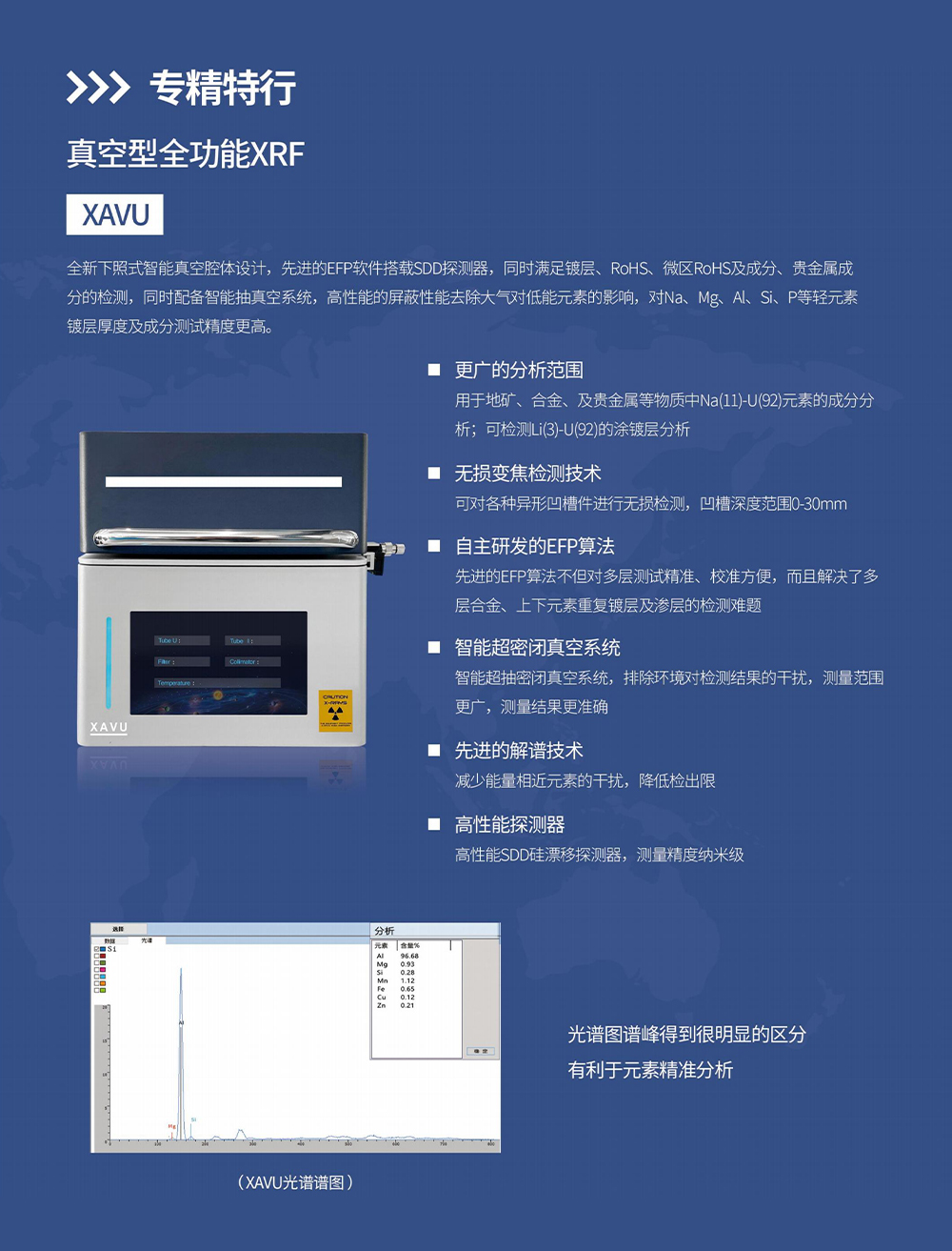 产品概述:全新下照式智能真空腔体设计,先进的EFP软件搭载SDD探测器,同时满足镀层、ROHS、微区ROHS及成分、贵金属成分的检测,同时配备智能抽真空系统,高性能的屏蔽性能去除大气对低能元素的影响,对Na、Mg、A、Si、P等轻元素镀层厚度及成分测试精度更高。