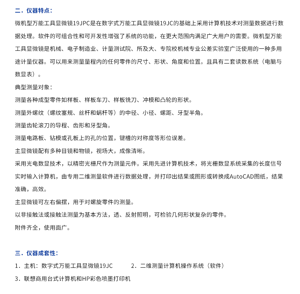 产品概述:19JPC微机型万能工具显微镜是应用计算机辅助测量的新一代万能工具显微镜,能解决各种复杂的二维测量需求。 传统的万工显对于视场中不能直接观测到的几何元素,如圆心、中点、交点、中心线及其相互距离、夹角等等需进行繁琐的测量和复杂的计算, 而在19JPC仪器上均能迎刃而…