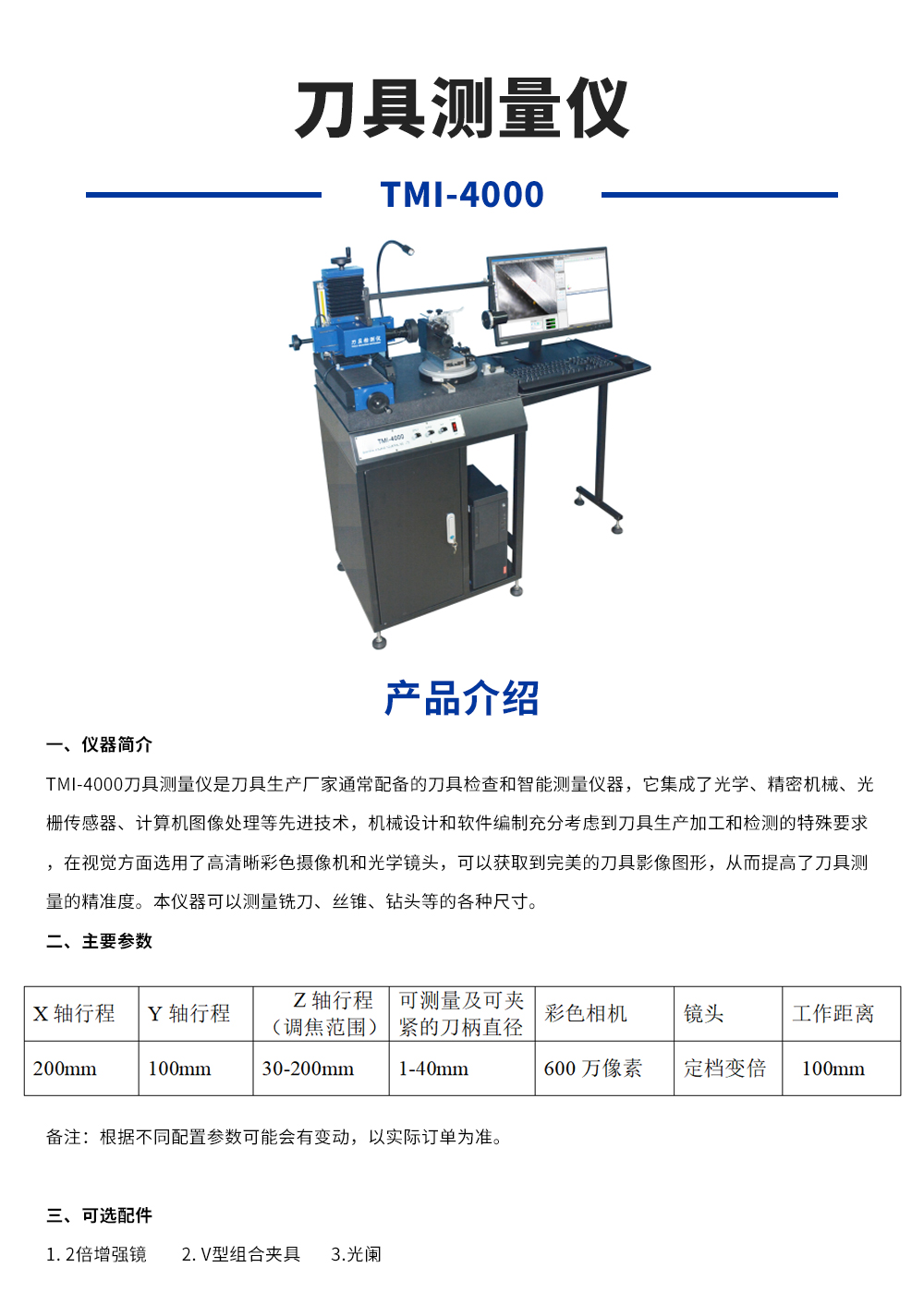 产品概述:TMI-4000刀具测量仪是刀具生产厂家通常配备的刀具检查和智能测量仪器,它集成了光学、精密机械、光栅传感器、计算机图像处理等先进技术