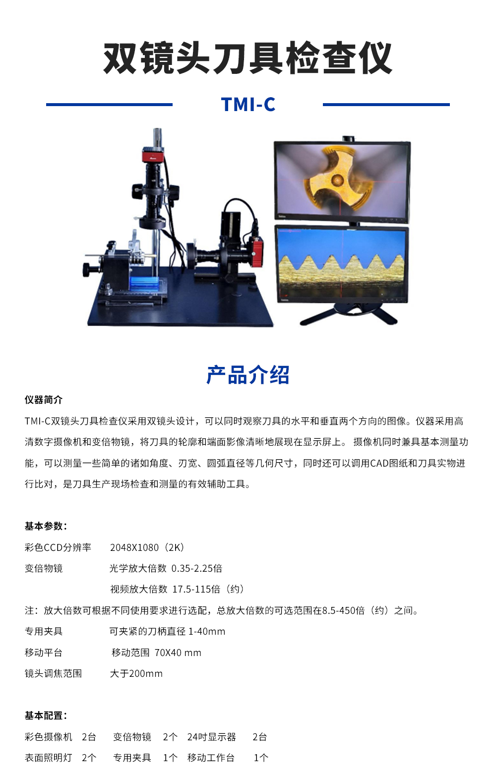 产品概述:TMI-C双镜头刀具检查仪采用双镜头设计,可以同时观察刀具的水平和垂直两个方向的图像。仪器采用高清数字摄像机和变倍物镜,将刀具的轮廓和端面影像清晰地展现在显示屏上。