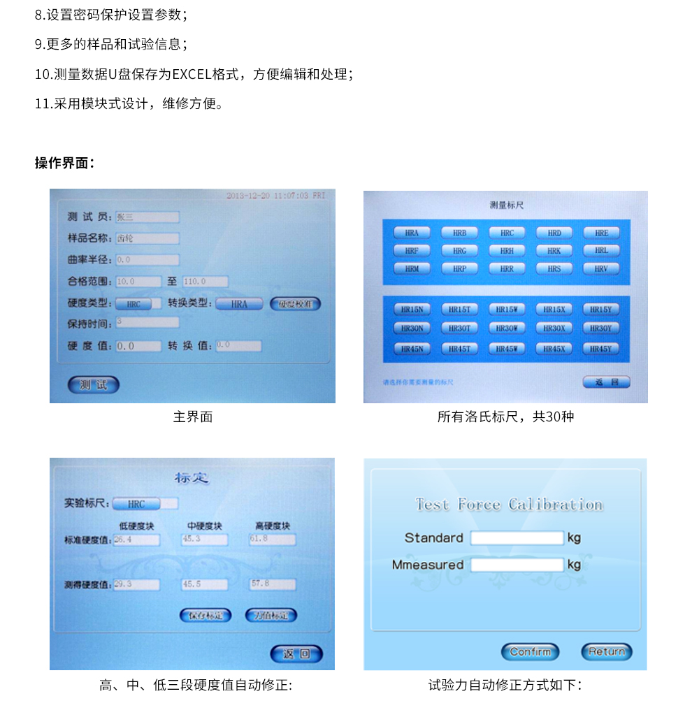 产品概述:电动加载,闭环控制;所有洛氏标尺,共30种;高、中、低三段硬度值自动修正;试验力自动修正,力的精度提高一个数量级;开机即用,无需安装砝码,无需安装调试;