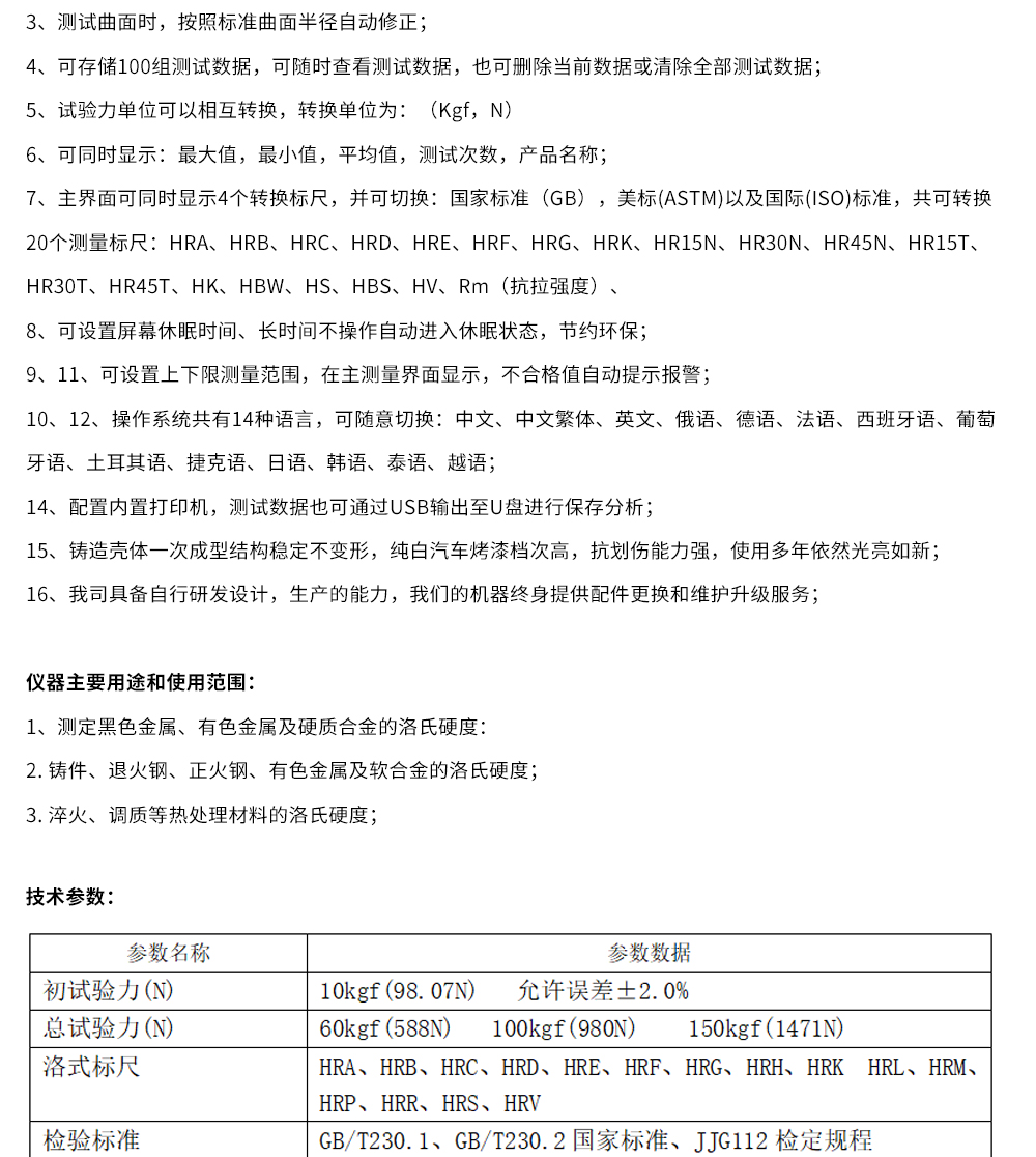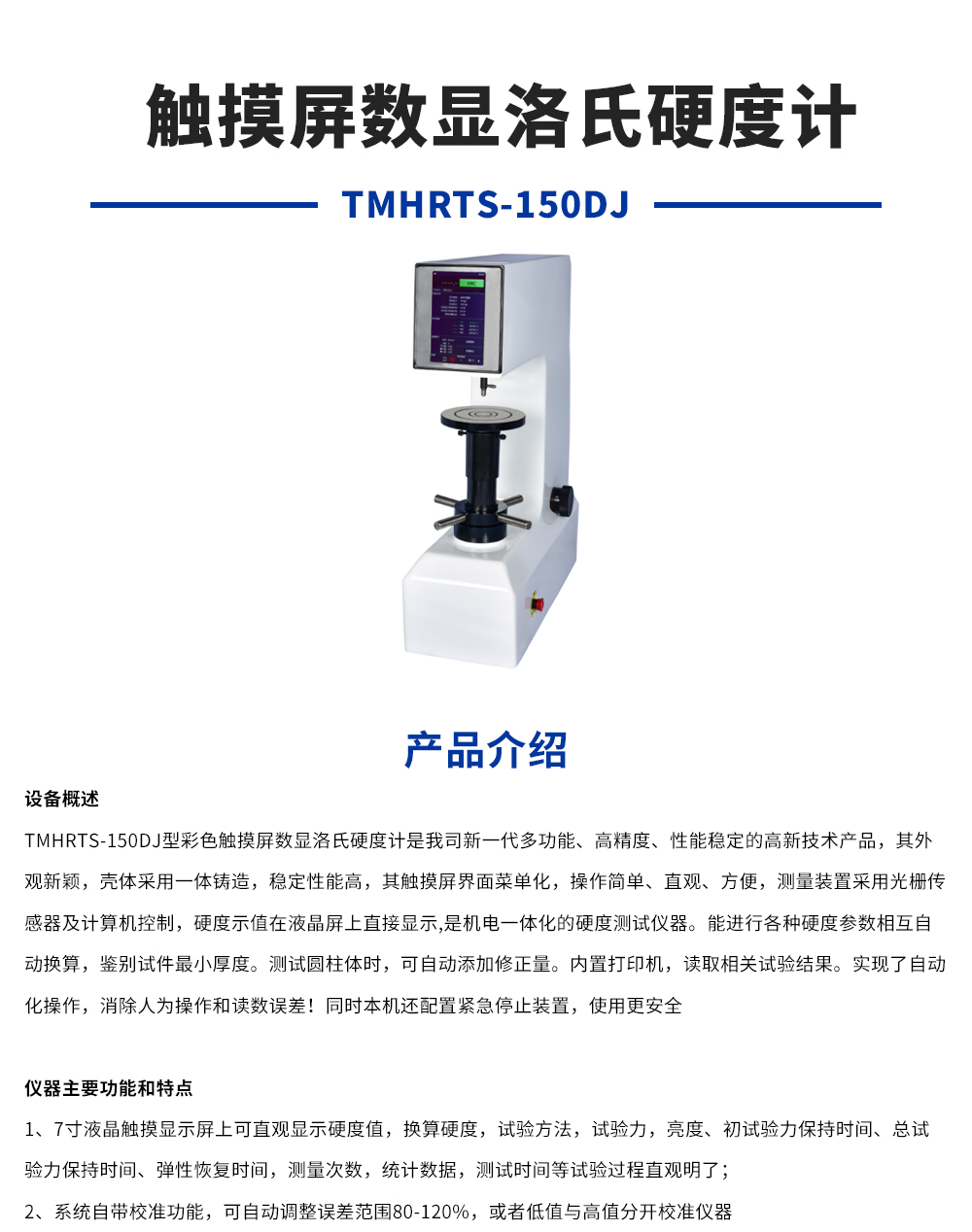 产品概述:TMHRTS-150DJ型彩色触摸屏数显洛氏硬度计是我司新一代多功能、高精度、性能稳定的高新技术产品,其外观新颖,壳体采用一体铸造,稳定性能高,其触摸屏界面菜单化,操作简单、直观、方便,测量装置采用光栅传感器及计算机控制,硬度示值在液晶屏上直接显示,是机电一体化的…