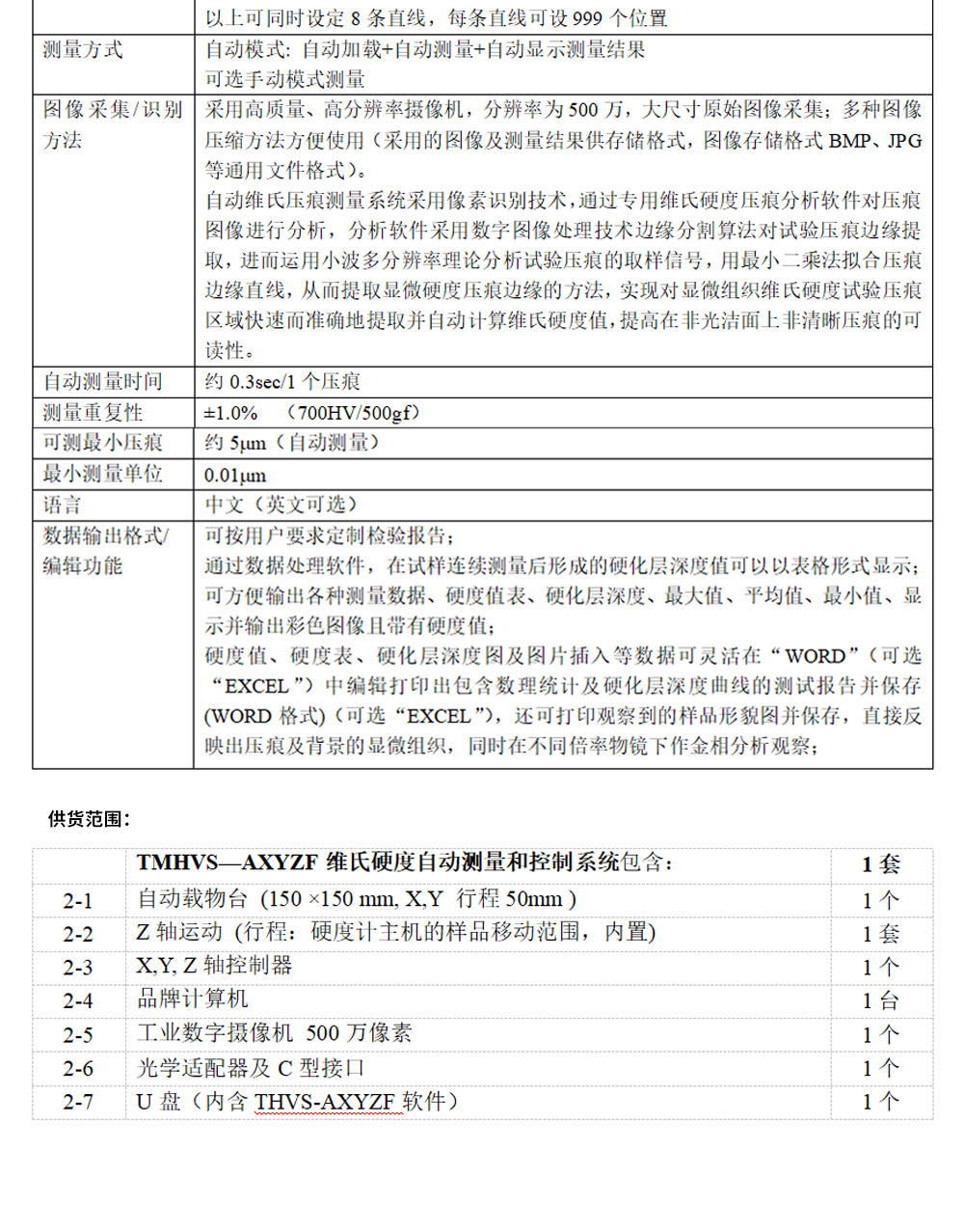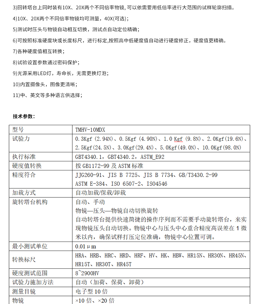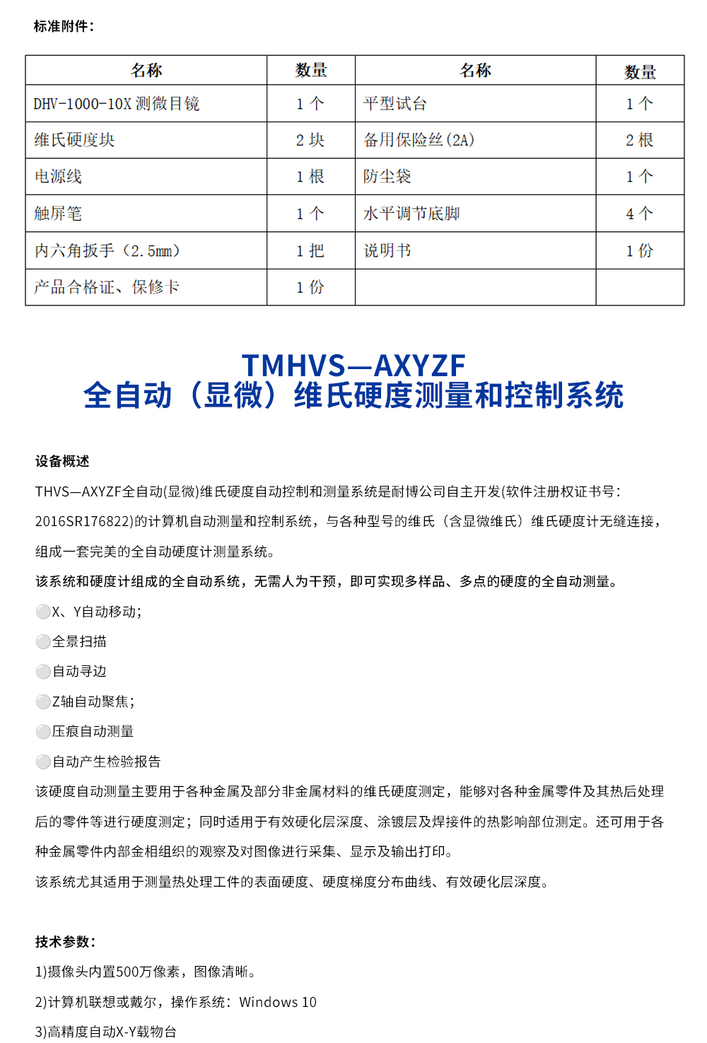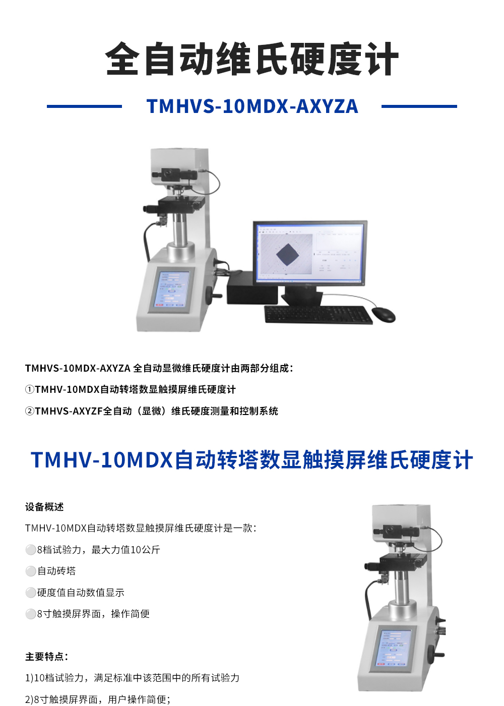 产品概述:TMHVS-10MDX-AXYZA 全自动显微维氏硬度计由两部分组成:TMHV-10MDX自动转塔数显触摸屏维氏硬度计以及TMHVS-AXYZF全自动(显微)维氏硬度测量和控制系统