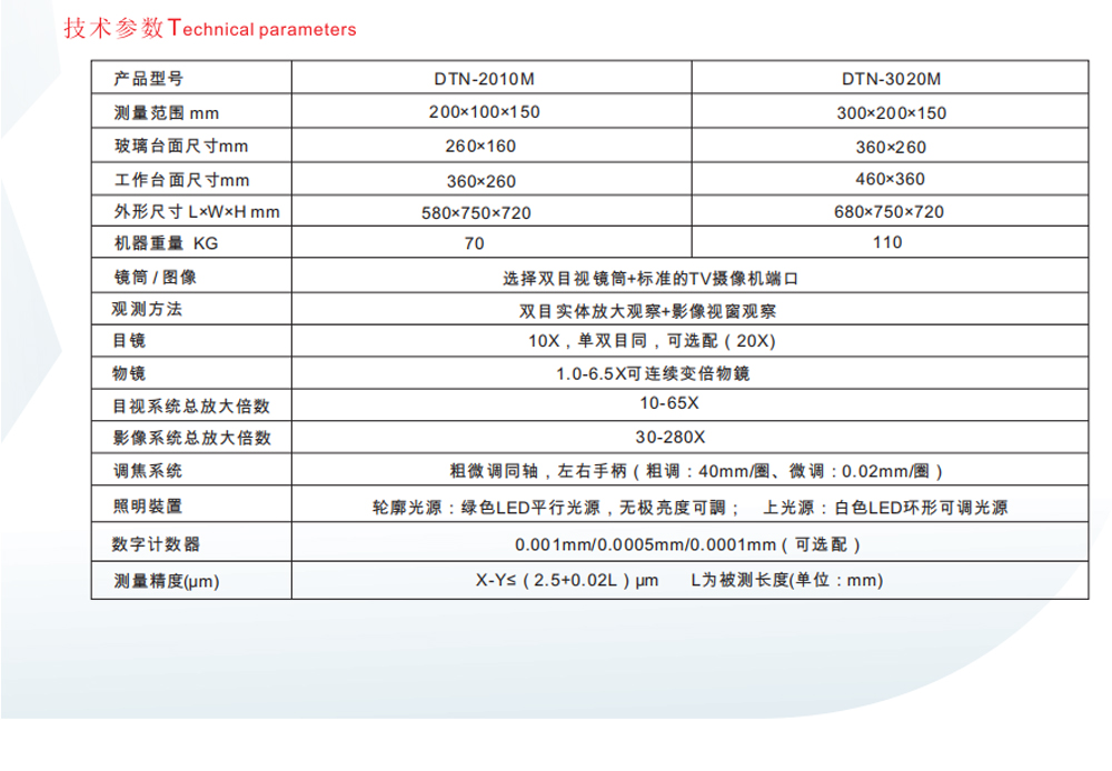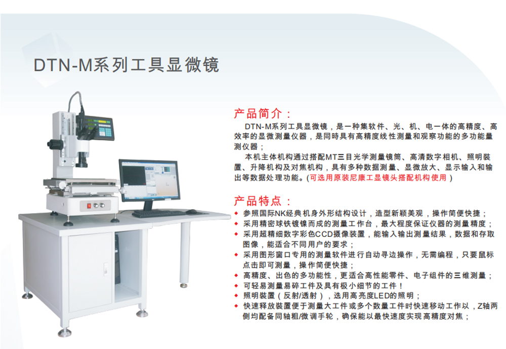产品概述:DTN-M系列工具显微镜,是一种集软件、光、机、电一体的高精度、高效率的显微测量仪器,是同時具有高精度线性測量和观察功能的多功能量测仪器;