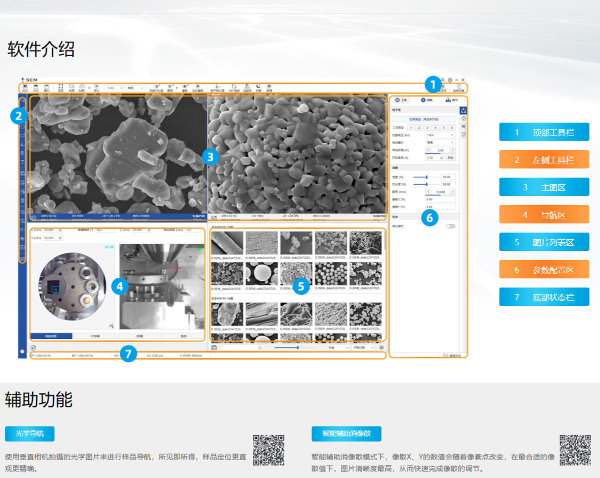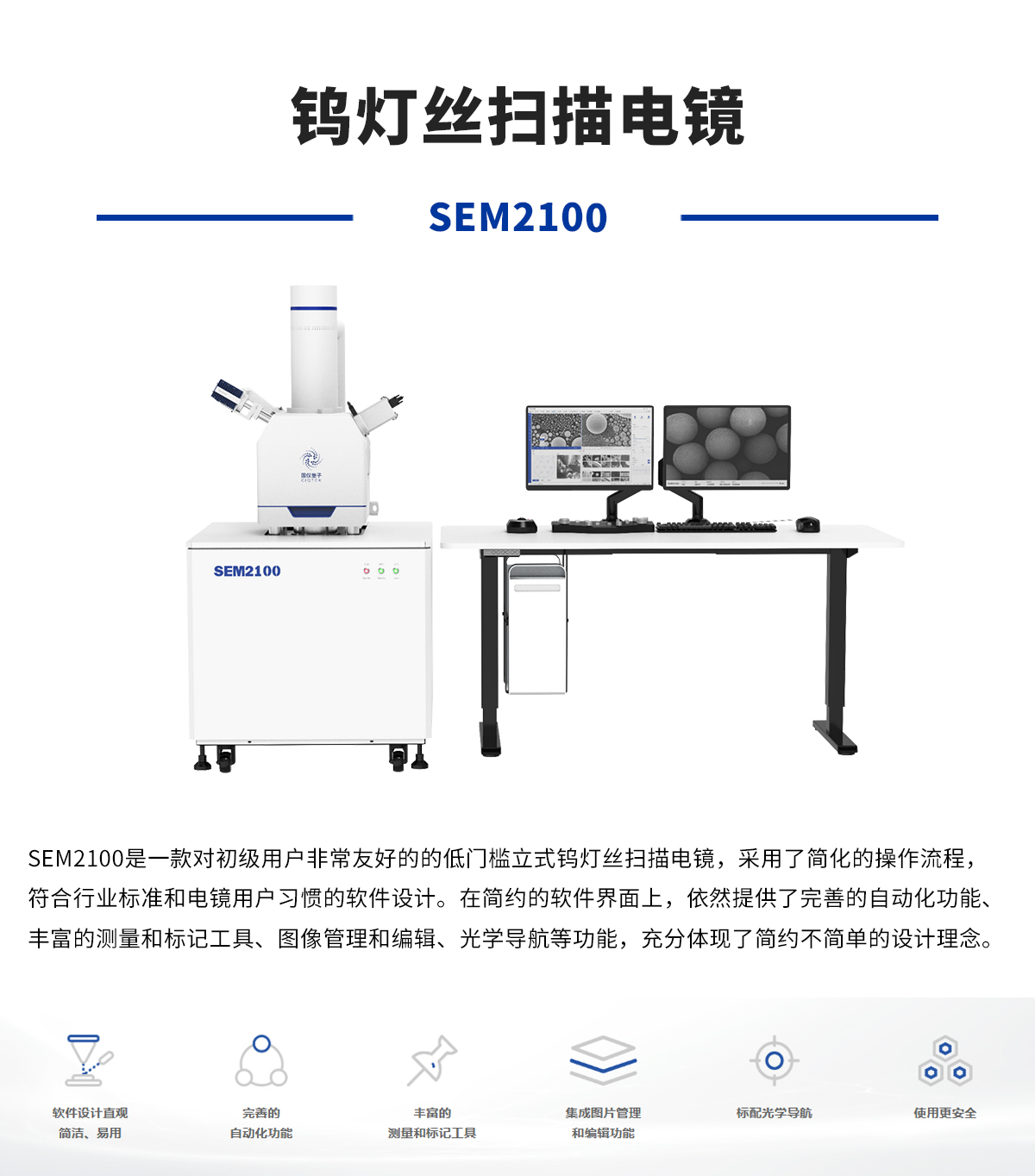 产品概述:SEM2100是一款对初级用户非常友好的的低门槛立式钨灯丝扫描电镜,采用了简化的操作流程,符合行业标准和电镜用户习惯的软件设计。