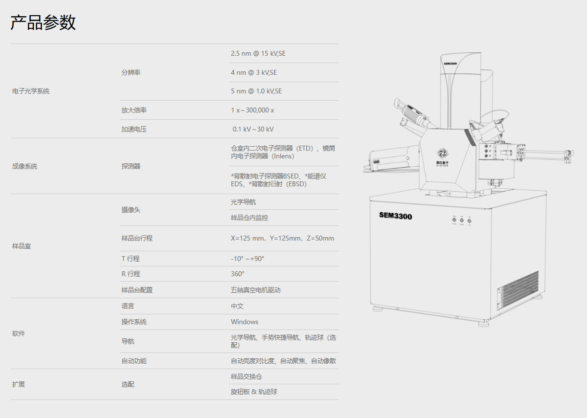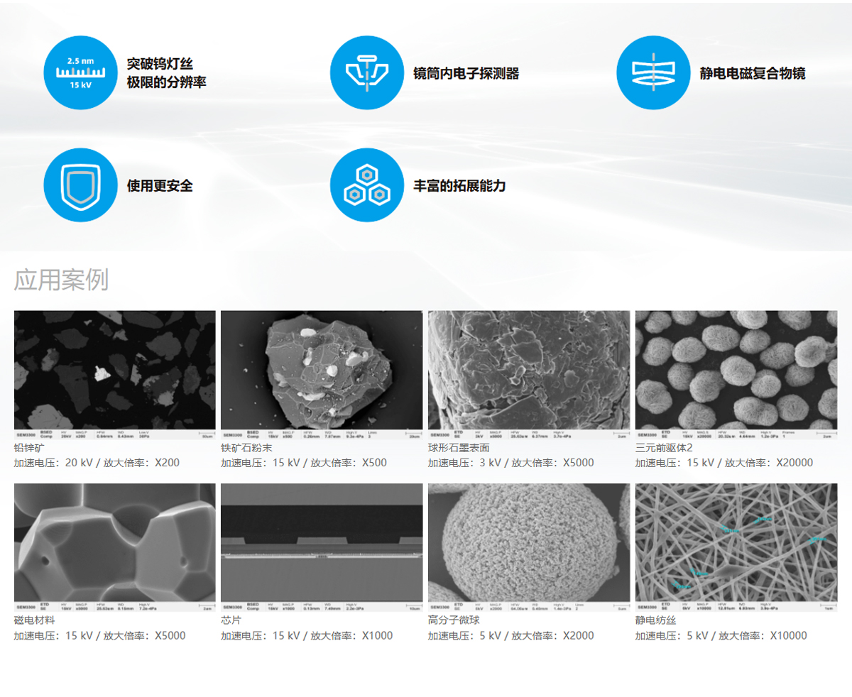 产品概述:SEM3300 是全新一代钨灯丝扫描电镜,将高压隧道技术(Super-Tunnel)、镜筒内电子探测器、静电电磁复合物镜等技术,应用在钨灯丝电镜上,突破了钨灯丝的分辨率极限,让钨灯丝电镜也能完成一部分场发射电镜才能完成的低电压分析任务。