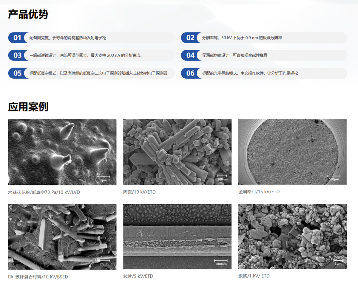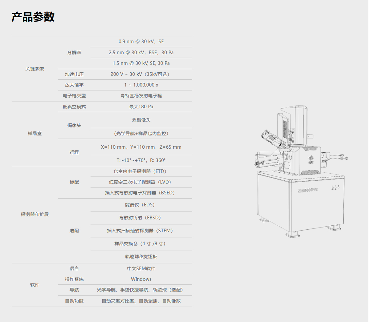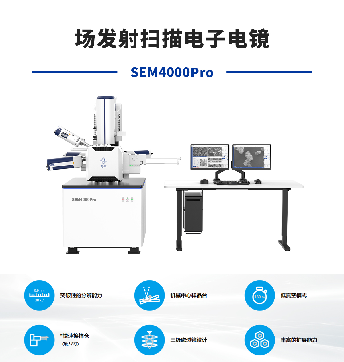 产品概述:SEM4000Pro是一款分析型热场发射扫描电子显微镜,配备了高亮度、长寿命的肖特基场发射电子枪。三级磁透镜设计,在EDS、EBSD、WDS等应用上具有明显优势。