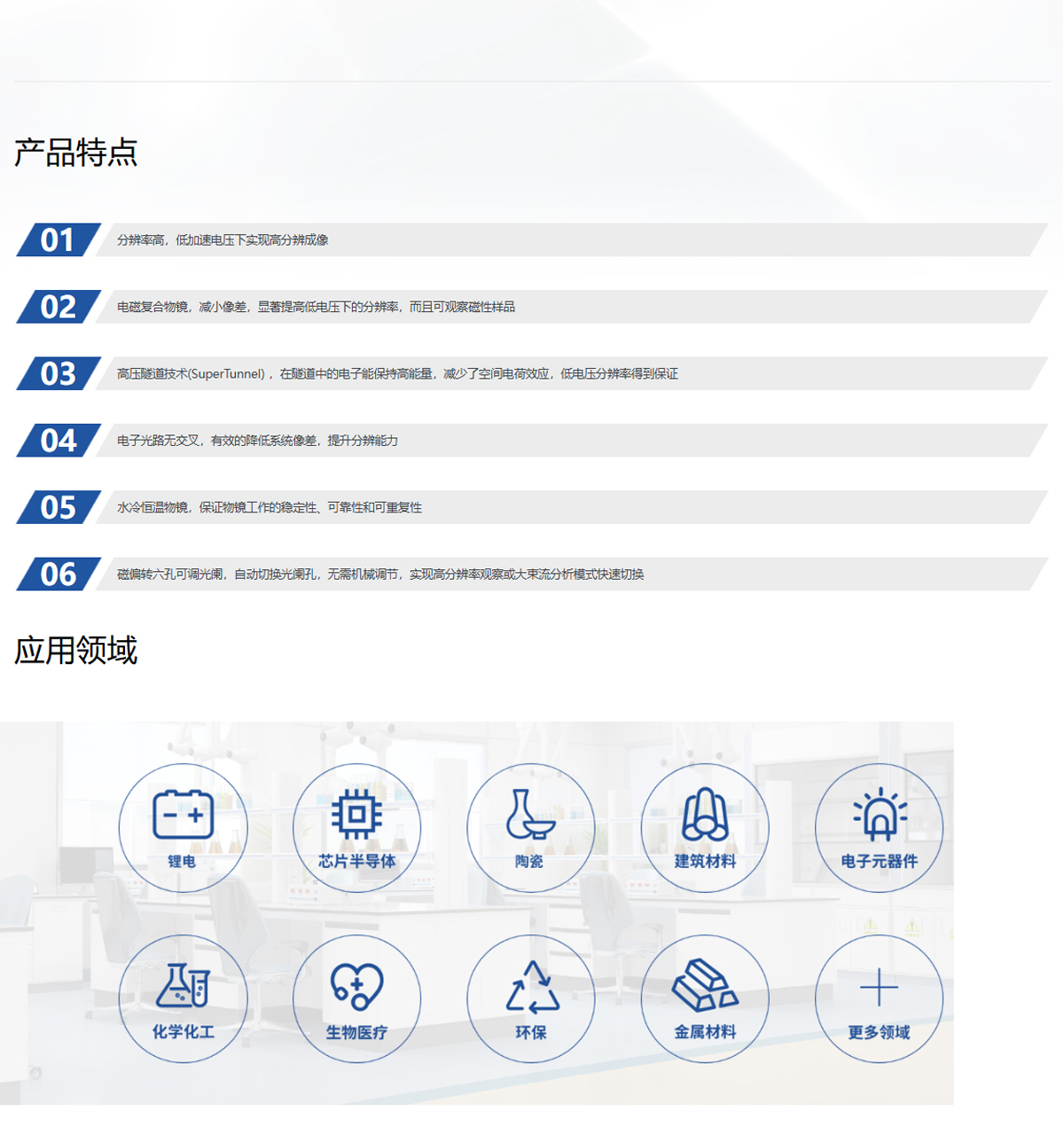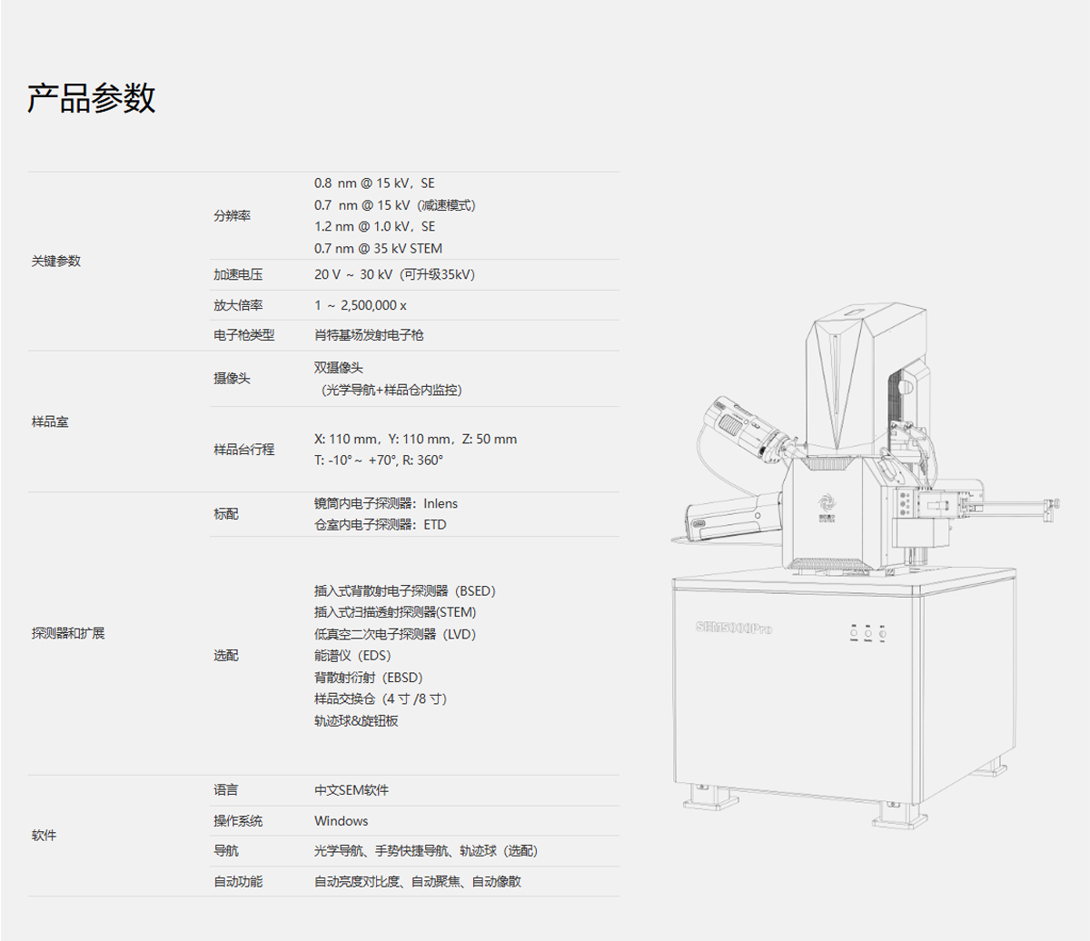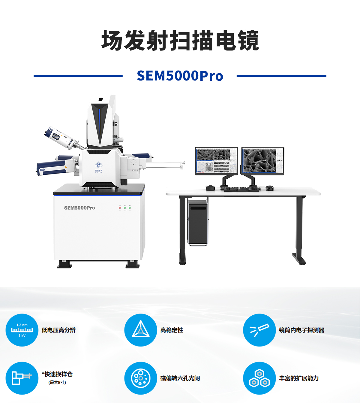 产品概述:SEM5000Pro是低电压高分辨的热场发射扫描电镜,使用了高压隧道技术(Super-Tunnel)、无交叉电子光路、静电电磁复台物镜设计,减少了空间电荷效应,降低系统像差,实现了 1.2 nm@1 kV 的分辨能力。