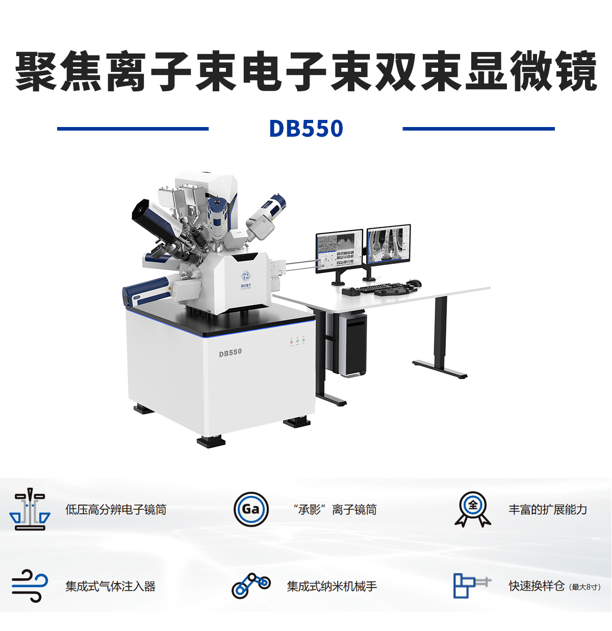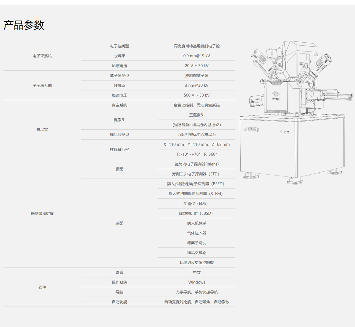 产品概述:DB550是一款优雅全能的纳米分析和制样工具,低电压高分辨的电子镜筒,保证纳米分析能力。“承影”离子镜筒提供了高稳定、高质量的离子束流,保证纳米加工能力。